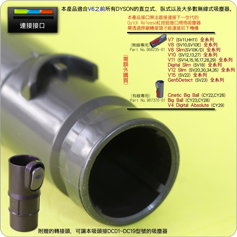 ◎適用機型:適合DYSON戴森V6之前所有的直立式、臥式及大多數無線式吸塵器新世代的Quick Release 紅按鈕接口規格的吸塵器,需加購原廠轉接頭(請看圖片說明)Dyson DC20Dyson DC21Dyson DC22Dyson DC23 Dyson DC24Dyson DC25 Dyson DC26Dyson DC27Dyson DC28Dyson DC30 Dyson DC31Dyson DC32Dyson DC33 Dyson DC34 Dyson DC35 Dyson DC36 Dyson DC37Dyson DC38Dyson DC39Dyson DC40Dyson DC41Dyson DC43Dyson DC43HDyson DC44 Dyson DC45 Dyson DC46 Dyson DC47Dyson DC48Dyson DC49Dyson DC50 Dyson DC52 CineticDyson DC53Dyson DC54Dyson DC55Dyson DC56Dyson DC57 Dyson DC58 Dyson DC59 Dyson DC61 Dyson DC62 Dyson DC63 Dyson DC65 Dyson DC74 Dyson CY24 BallDyson CY25 BallDyson V6 SV03 Dyson V6 SV04 Dyson V6 SV05 Dyson V6 SV06 Dyson V6 SV07 Dyson V6 SV08 Dyson V6 SV09 Dyson V6 HH08Dyson V6 Mattress Dyson V6 Motorhead Dyson V6 HEPA Dyson V6 Fluffy Dyson V6 Absolute Dyson V6 Cord Free Dyson V6 Cord Free+ Dyson V6 Cord Free Extra Dyson V6 Cord Free Origin Dyson V6 Cord Free Pro Dyson V6 Cord Free Plus