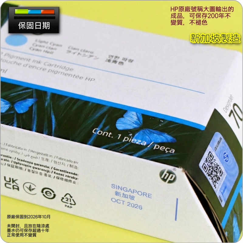 整套含:C9390A 淺青色██████ Light Cyan一顆墨水匣規格:保固日期:2026年10月(如圖所示)容 量:130ml可印張數:1650 pages(HP原廠公告值)包裝方式:HP原廠紙盒密封包裝放置陰涼處,約可保存超過十年不變質(HP原廠號稱,列印出的成品,可保存200年不褪色、不變質)
