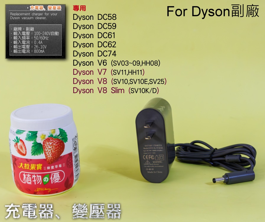 相容dyson副廠產品 Dyson吸塵器用的充電器、變壓器,適用機型如表列。 輸出電壓為26.10V,電流為800mA。 只要您的dyson吸塵器可接受的電壓為26.10V的話,就可以使用 產品狀態:副廠全新產品、未使用