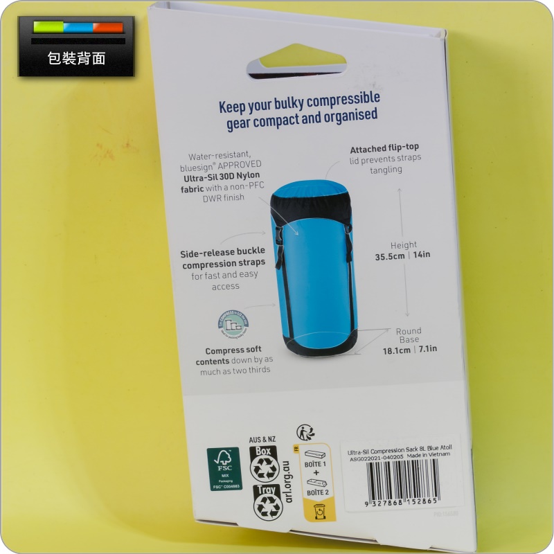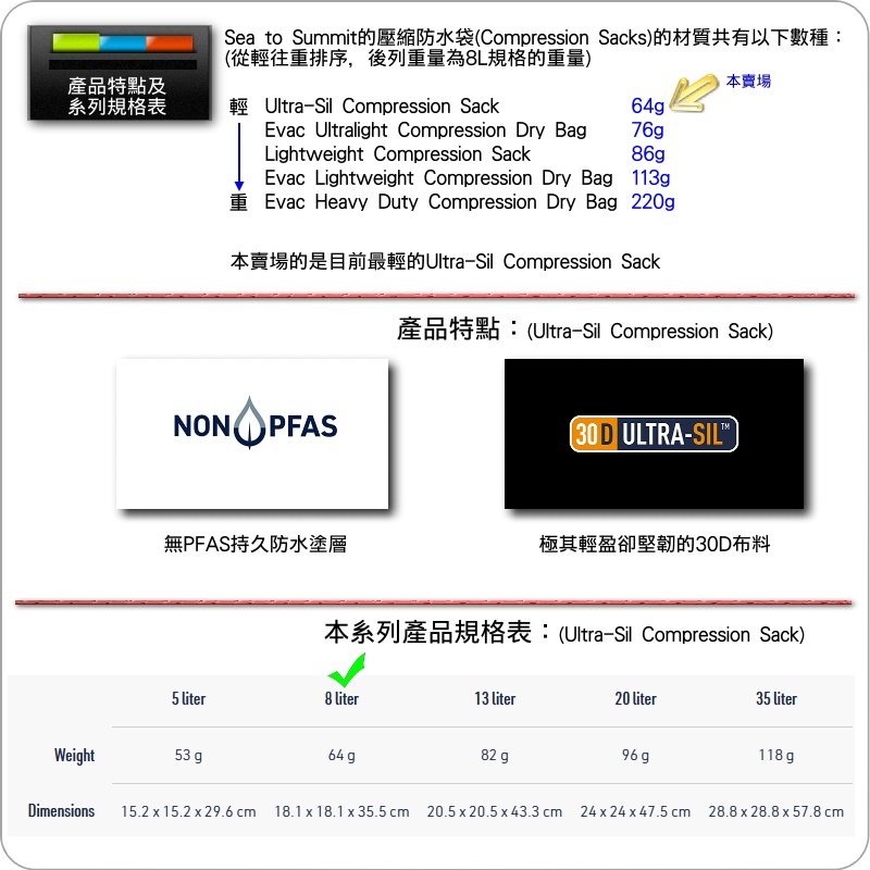 產品簡介:當您需要在不顯著增加重量的情況下壓縮所攜帶的衣物、睡袋等物品體積時,Ultra-Sil壓縮袋是絕佳之選這款壓縮袋採用防水且通過 bluesign® 認證的 Ultra-Sil 30D 尼龍面料製成並經過Non-PFC DWR防水處理,其耐用性遠超其輕巧的重量非常適合放置在背包或旅行包內,用於壓縮衣物或體積較大的柔軟物品以便騰出空間放置其他必需品或度假用品產品特點:.將柔軟的衣物、睡袋壓縮為原來1/3體積.側開式扣環壓縮帶,方便快速取用.採用防水、bluesign® 認證的 Ultra-Sil 30D尼龍布料,且經不含PFC的DWR防水處理.三條超輕壓縮帶,配有兩個梯形鎖扣和一個側開扣,方便取用並減輕重量。.帶翻蓋的蓋子可以防止壓縮帶纏繞系列產品比較:Sea to Summit的壓縮防水袋(Compression Sacks)的材質共有以下數種:(從輕往重排序,後列重量為8L規格的重量)