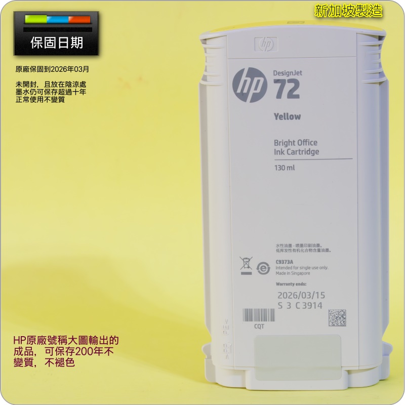 HP NO.72 C9373A 【黃】原廠墨水匣-盒裝(2026年03月)外盒及內袋皆破損