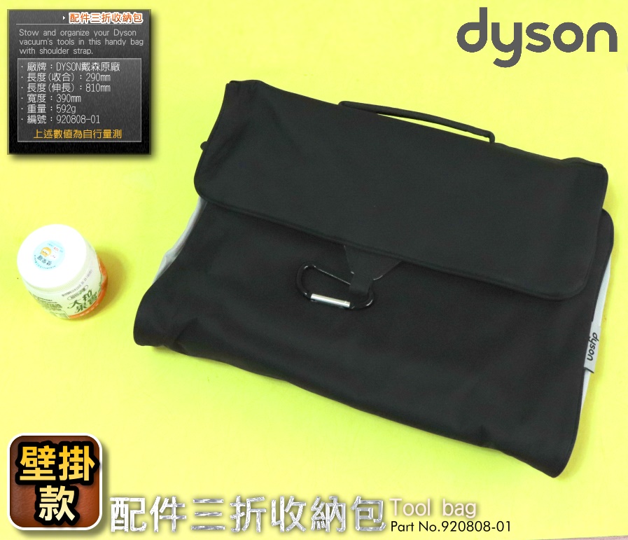 Dyson原廠專用工具、吸頭收納包:可收納主吸頭(一個)、各式小吸頭,附有小勾環,可掛於牆壁上。附有提把,可以外出攜行外出清潔轎車內部上方有數個小口袋及一個大網袋,可以裝入小型吸頭下方有大口袋,可以裝入主吸頭1個,再塞入一、兩個小吸頭產品狀態:Dyson原廠全新產品、未使用、無原廠外紙盒包裝