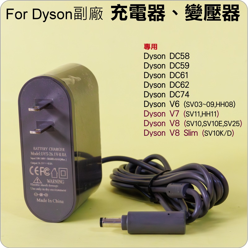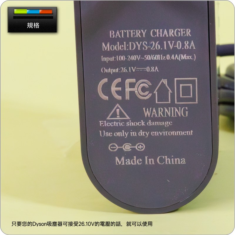 相容dyson副廠產品 Dyson吸塵器用的充電器、變壓器,適用機型如表列。 輸出電壓為26.10V,電流為800mA。 只要您的dyson吸塵器可接受的電壓為26.10V的話,就可以使用 產品狀態:副廠全新產品、未使用