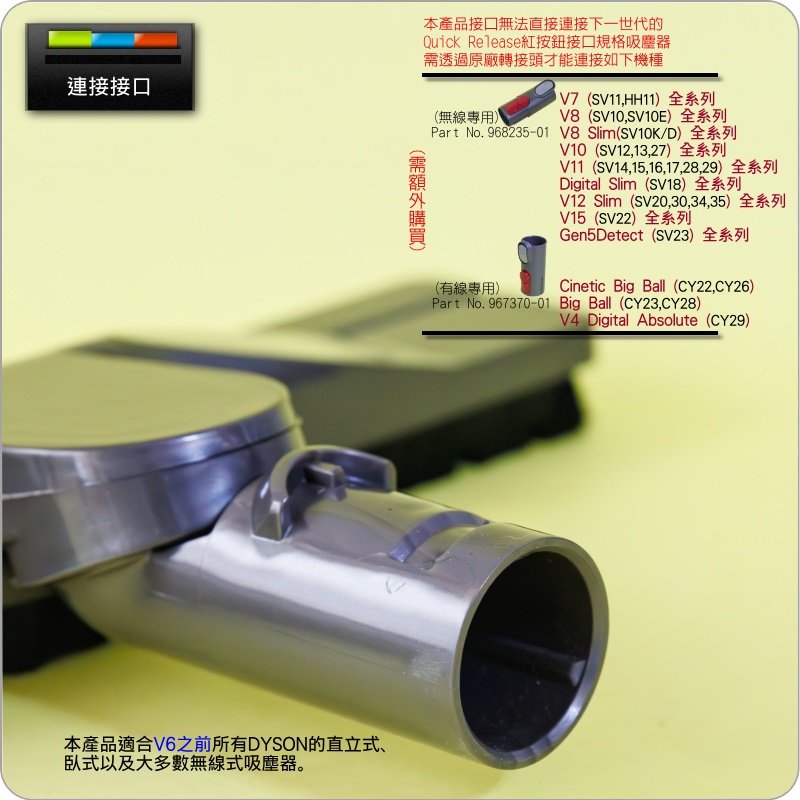 ◎適用機型:適合DYSON戴森V6之前所有的直立式、臥式及大多數無線式吸塵器新世代的Quick Release 紅按鈕接口規格的吸塵器,需加購原廠轉接頭(請看圖片說明)下列機種為可直接接上的吸塵器Dyson DC20Dyson DC21Dyson DC22Dyson DC23 Dyson DC24Dyson DC25 Dyson DC26Dyson DC27Dyson DC28Dyson DC30 Dyson DC31Dyson DC32Dyson DC33 Dyson DC34 Dyson DC35 Dyson DC36 Dyson DC37Dyson DC38Dyson DC39Dyson DC40Dyson DC41Dyson DC43Dyson DC43HDyson DC44 Dyson DC45 Dyson DC46 Dyson DC47Dyson DC48Dyson DC49Dyson DC50 Dyson DC52 CineticDyson DC53Dyson DC54Dyson DC55Dyson DC56Dyson DC57 Dyson DC58 Dyson DC59 Dyson DC61 Dyson DC62 Dyson DC63 Dyson DC65 Dyson DC74 Dyson CY24 Ball Fluffy Dyson V6 SV03 Dyson V6 SV04 Dyson V6 SV05 Dyson V6 SV06 Dyson V6 SV07 Dyson V6 SV08 Dyson V6 SV09 Dyson V6 Mattress Dyson V6 Motorhead Dyson V6 HEPA Dyson V6 Fluffy Dyson V6 Absolute Dyson V6 Cord Free Dyson V6 Cord Free+ Dyson V6 Cord Free Extra Dyson V6 Cord Free Origin Dyson V6 Cord Free Pro Dyson V6 Cord Free Plus