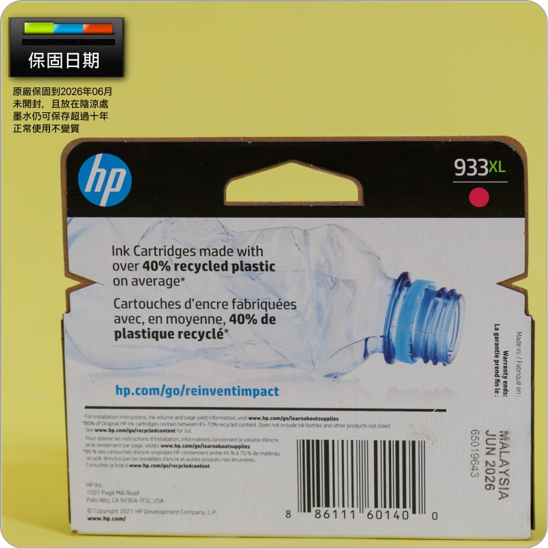 規格: 容 量:9 ml 可印張數:825 pages 保固日期:2026年06月(如圖所示) 包裝方式:HP原廠密封紙盒包裝