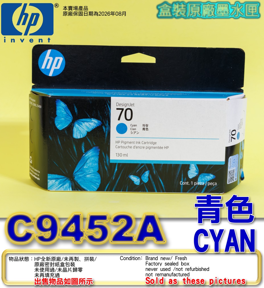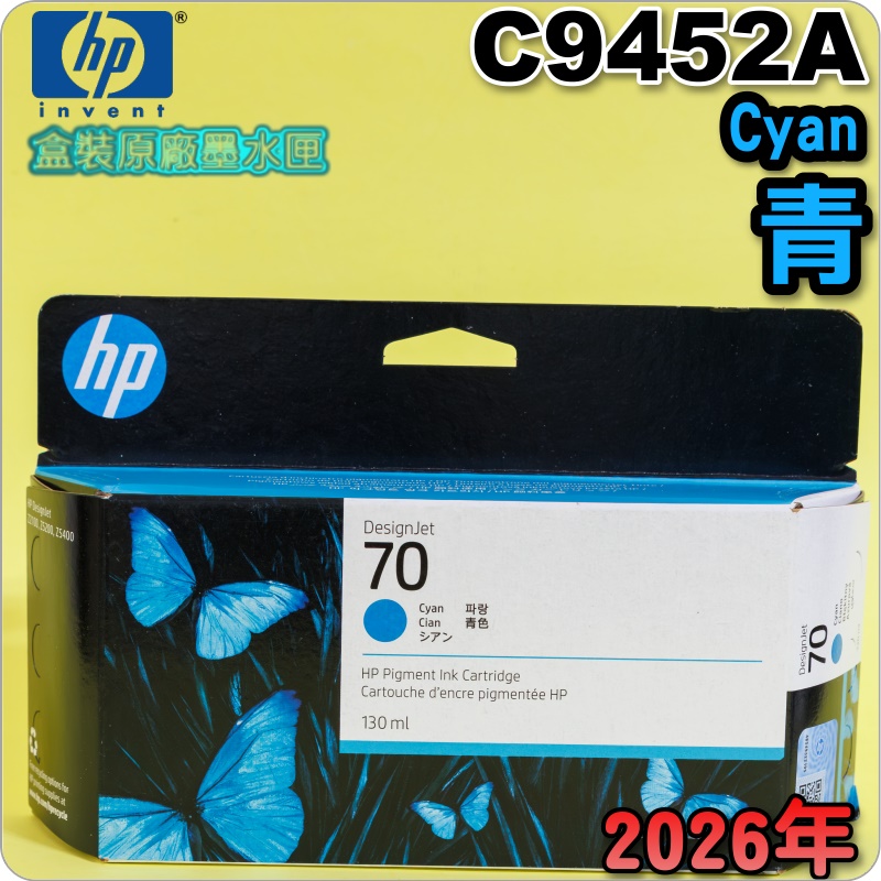 品名:HP NO.70 C9452A原廠墨水匣 【青】(CYAN)-盒裝版(2026年08月)(130ml) DesignJet Z2100 Z5200