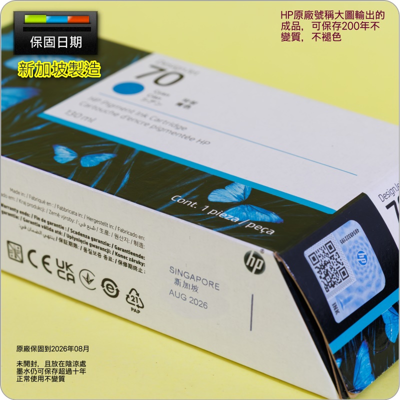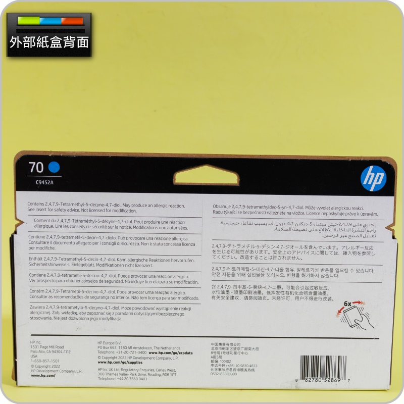 整套含:C9452A 青色██████ CYAN一顆墨水匣規格:保固日期:2026年08月(如圖所示)容 量:130ml可印張數:1650 pages(HP原廠公告值)包裝方式:HP原廠紙盒密封包裝放置陰涼處,約可保存超過十年不變質(HP原廠號稱,列印出的成品,可保存200年不褪色、不變質)