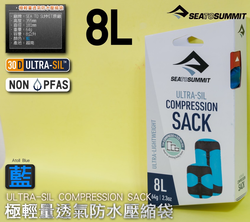 整套含:SEA TO SUMMIT原廠30D ULTRA-SIL極輕透氣防水壓縮袋【8L】【藍】規格:廠牌:SEA TO SUMMIT原廠容量:8L顏色:藍長度:355mm寬度:181mm厚度:181mm材質:Ultra-Sil 30D 尼龍布料產地:越南重量:64g包裝:原廠紙盒外包裝