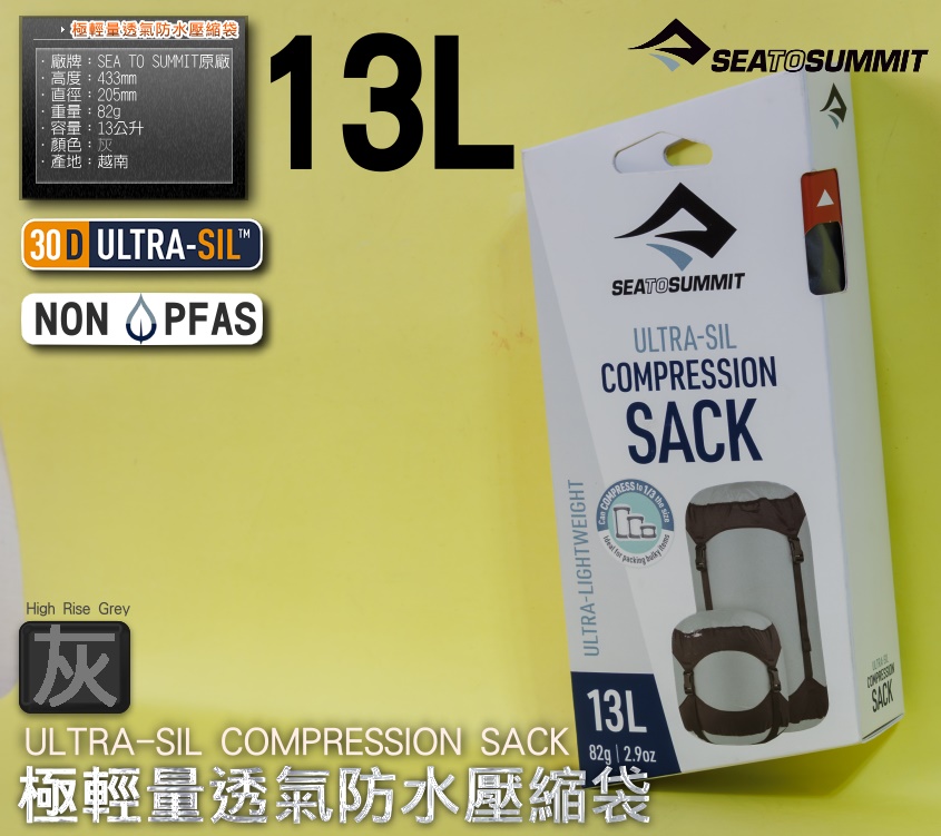整套含:SEA TO SUMMIT原廠30D ULTRA-SIL極輕透氣防水壓縮袋【13L】【灰】規格:廠牌:SEA TO SUMMIT原廠容量:8L顏色:灰長度:433mm寬度:205mm厚度:205mm材質:Ultra-Sil 30D 尼龍布料產地:越南重量:82g包裝:原廠紙盒外包裝