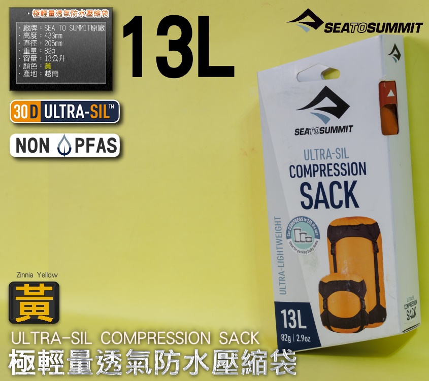 整套含:SEA TO SUMMIT原廠30D ULTRA-SIL極輕透氣防水壓縮袋【13L】【黃】規格:廠牌:SEA TO SUMMIT原廠容量:8L顏色:黃長度:433mm寬度:205mm厚度:205mm材質:Ultra-Sil 30D 尼龍布料產地:越南重量:82g包裝:原廠紙盒外包裝