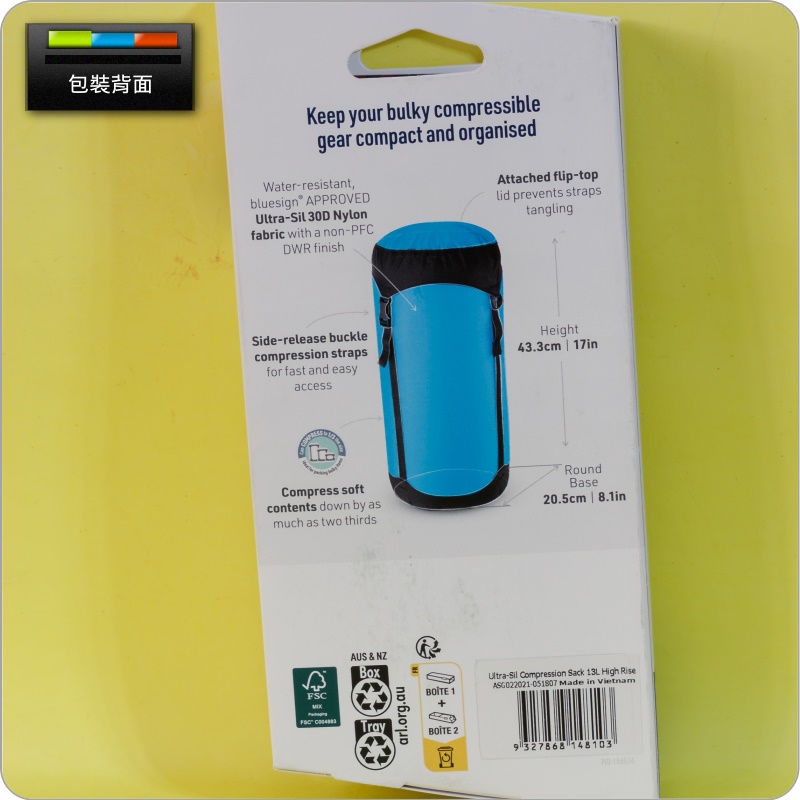 整套含:SEA TO SUMMIT原廠30D ULTRA-SIL極輕透氣防水壓縮袋【13L】【藍】規格:廠牌:SEA TO SUMMIT原廠容量:8L顏色:藍長度:433mm寬度:205mm厚度:205mm材質:Ultra-Sil 30D 尼龍布料產地:越南重量:82g包裝:原廠紙盒外包裝