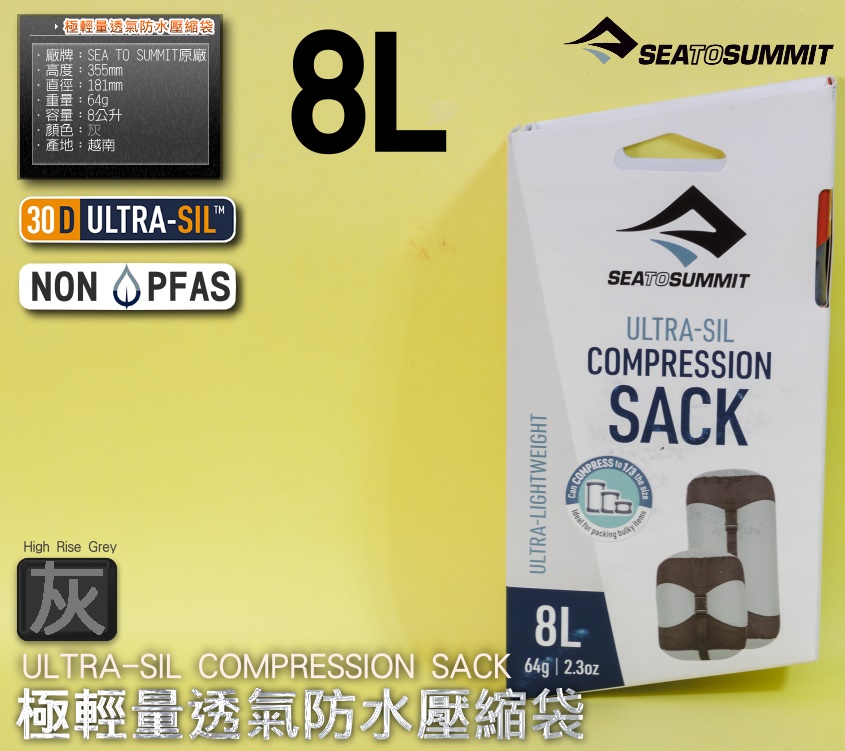 整套含:SEA TO SUMMIT原廠30D ULTRA-SIL極輕透氣防水壓縮袋【8L】【灰】規格:廠牌:SEA TO SUMMIT原廠容量:8L顏色:灰長度:355mm寬度:181mm厚度:181mm材質:Ultra-Sil 30D 尼龍布料產地:越南重量:64g包裝:原廠紙盒外包裝