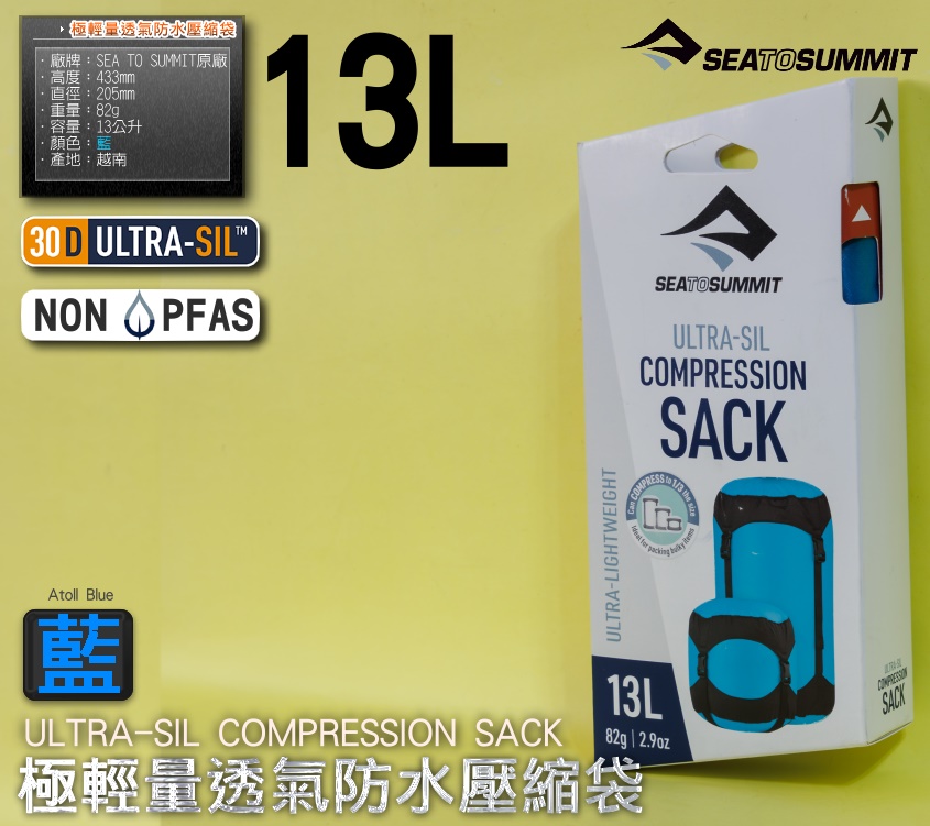 整套含:SEA TO SUMMIT原廠30D ULTRA-SIL極輕透氣防水壓縮袋【13L】【藍】規格:廠牌:SEA TO SUMMIT原廠容量:13L顏色:藍長度:433mm寬度:205mm厚度:205mm材質:Ultra-Sil 30D 尼龍布料產地:越南重量:82g包裝:原廠紙盒外包裝